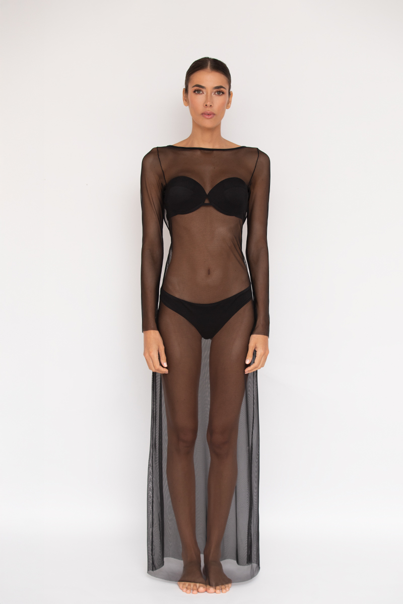 VESTIDO ELABORADO EN MAYA ELASTICA, TRANSPARENTE IDEAL COMO COMPLEMENTO DE LOS TRAJES DE BAÑO .